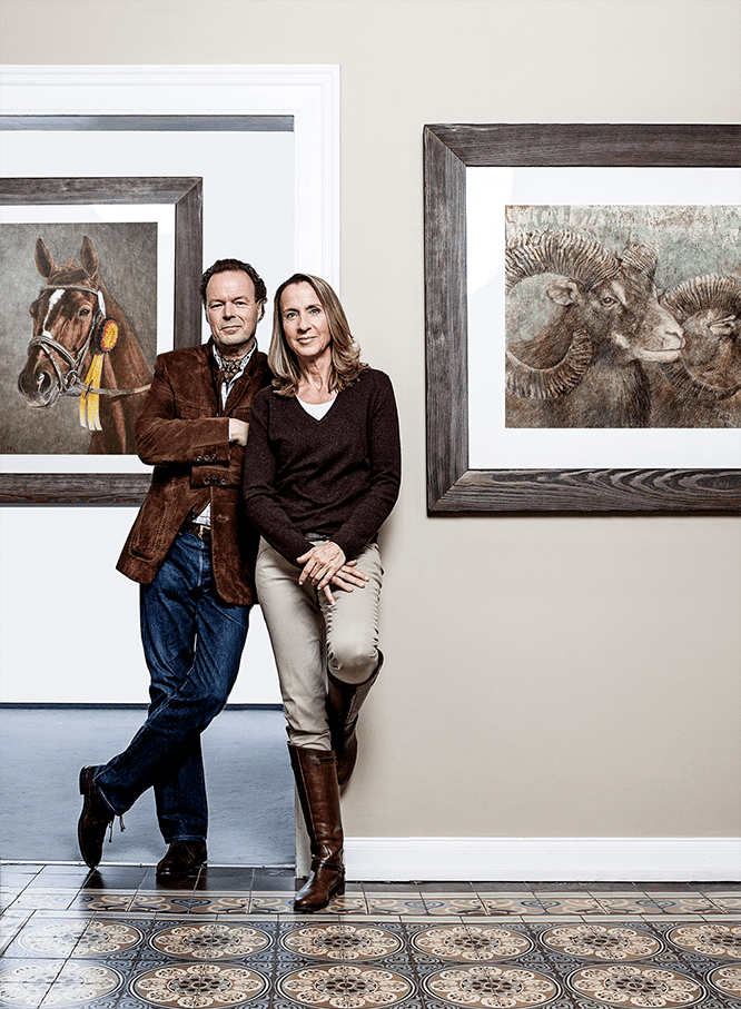 In ihren Auftragsarbeiten für Hunde- und Pferdebesitzer, Jäger und Falkner verbinden sie die über alle Kunstepochen beliebte und traditionelle Tierportraitmalerei mit einer modernen Formensprache.
