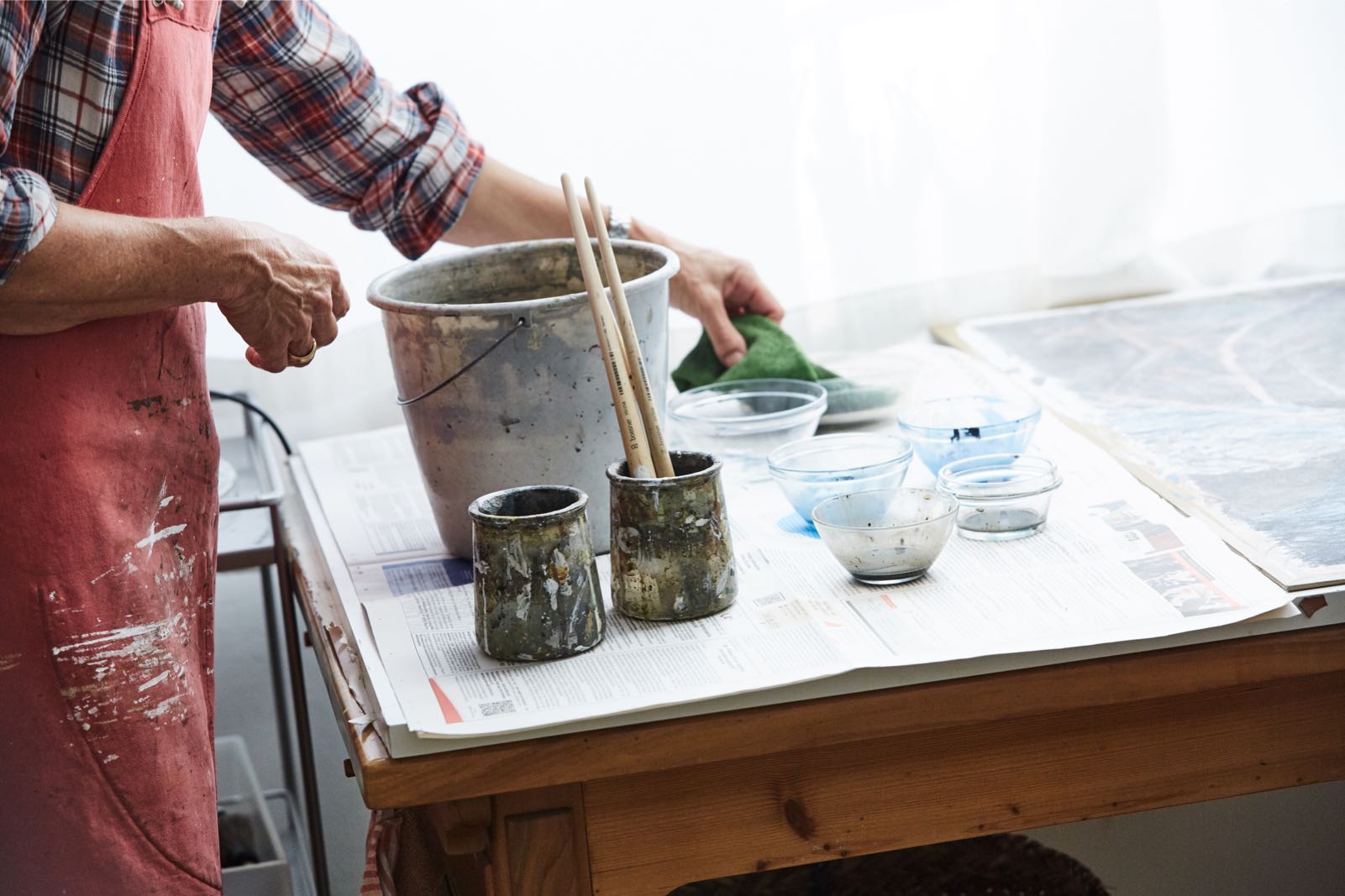 Sascha Bianca Maas bereitet die Leinwand in ihrer speziellen Lasurtechnik mit zum Motiv passenden Strukturen vor. Dabei bringt sie mit verschiedenen Instrumenten einen pastosen Malgrund auf.