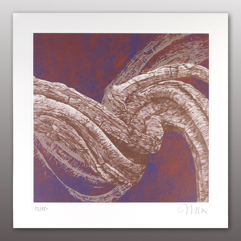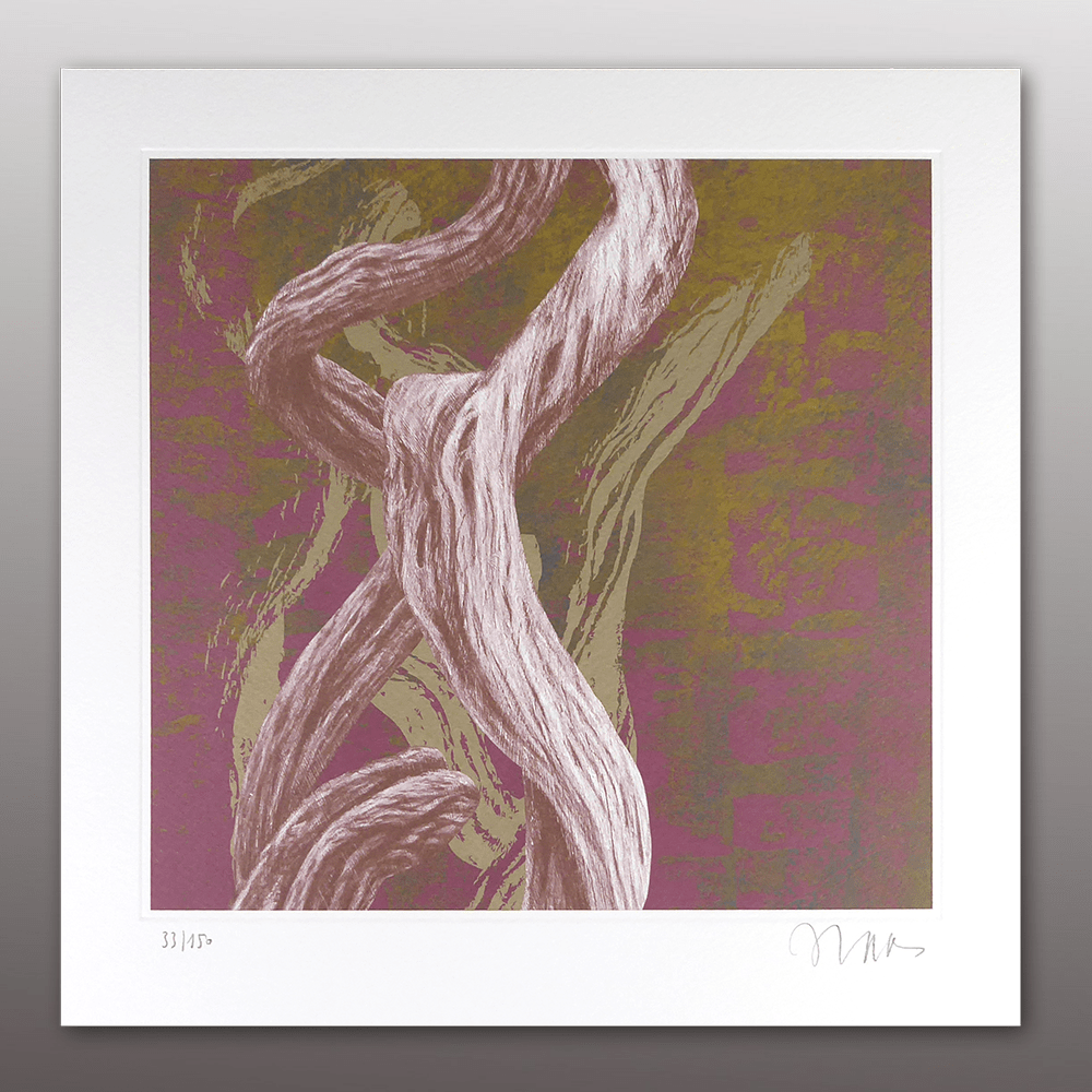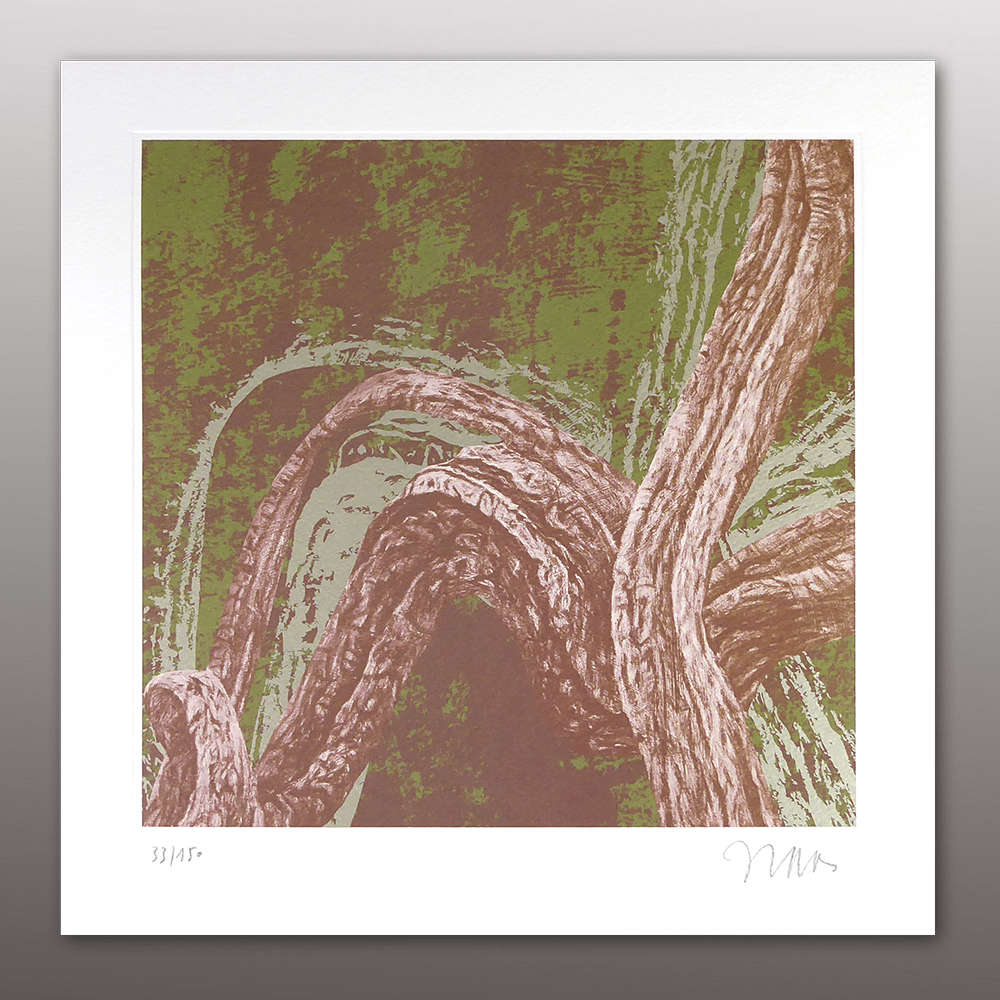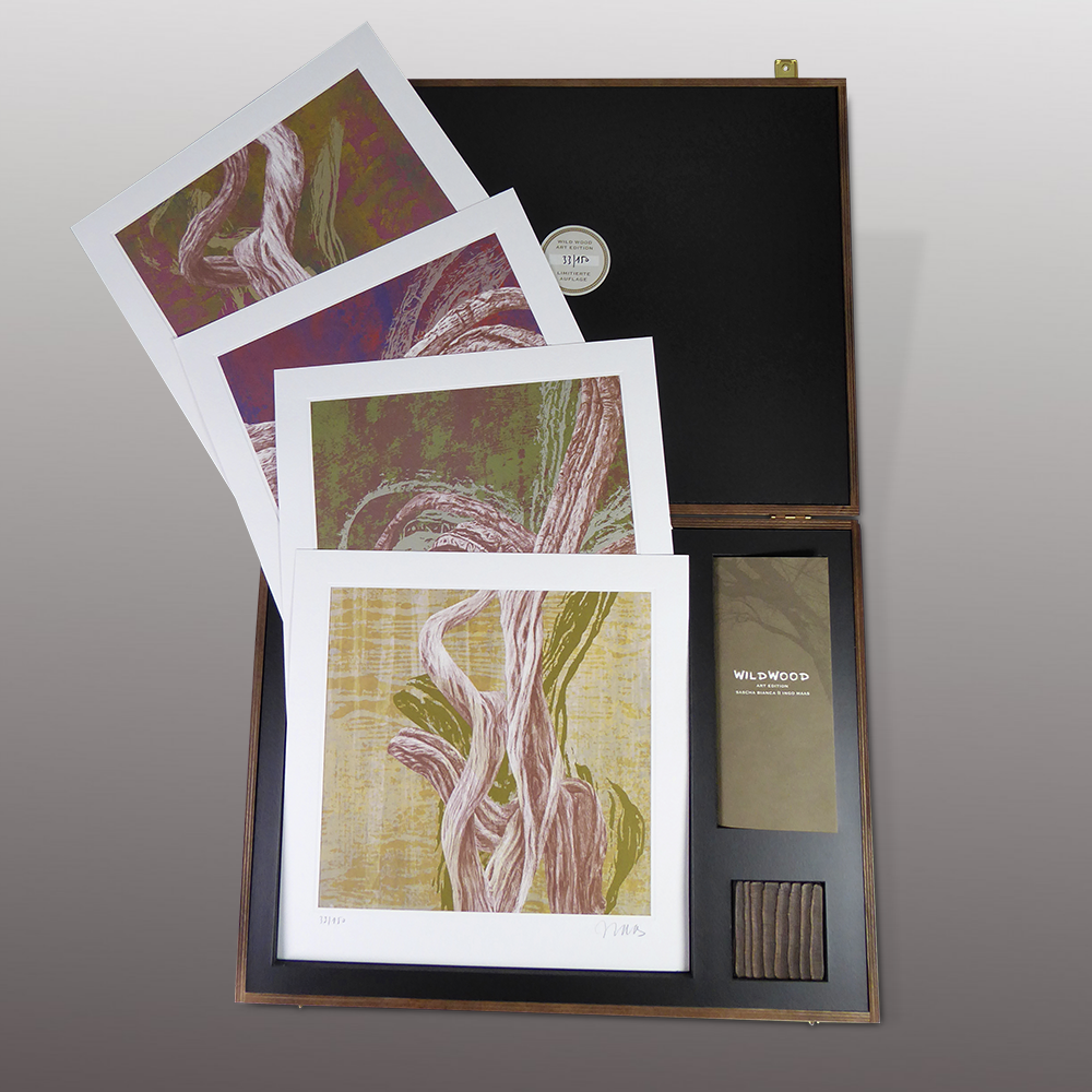 Vier Siebdrucke 6-farbig mit Prägung im Format 32 x 32 cm auf Büttenkarton, Motive I – IV, in Holzkassette im Format 49 x 38 x 5 cm, 12-seitiges Booklet mit Werkbeschreibung und Abbildungen, Holzstück der Originalrahmen, gebürstet und gebeizt im Format 7 x 7 cm, nummeriert und signiert.